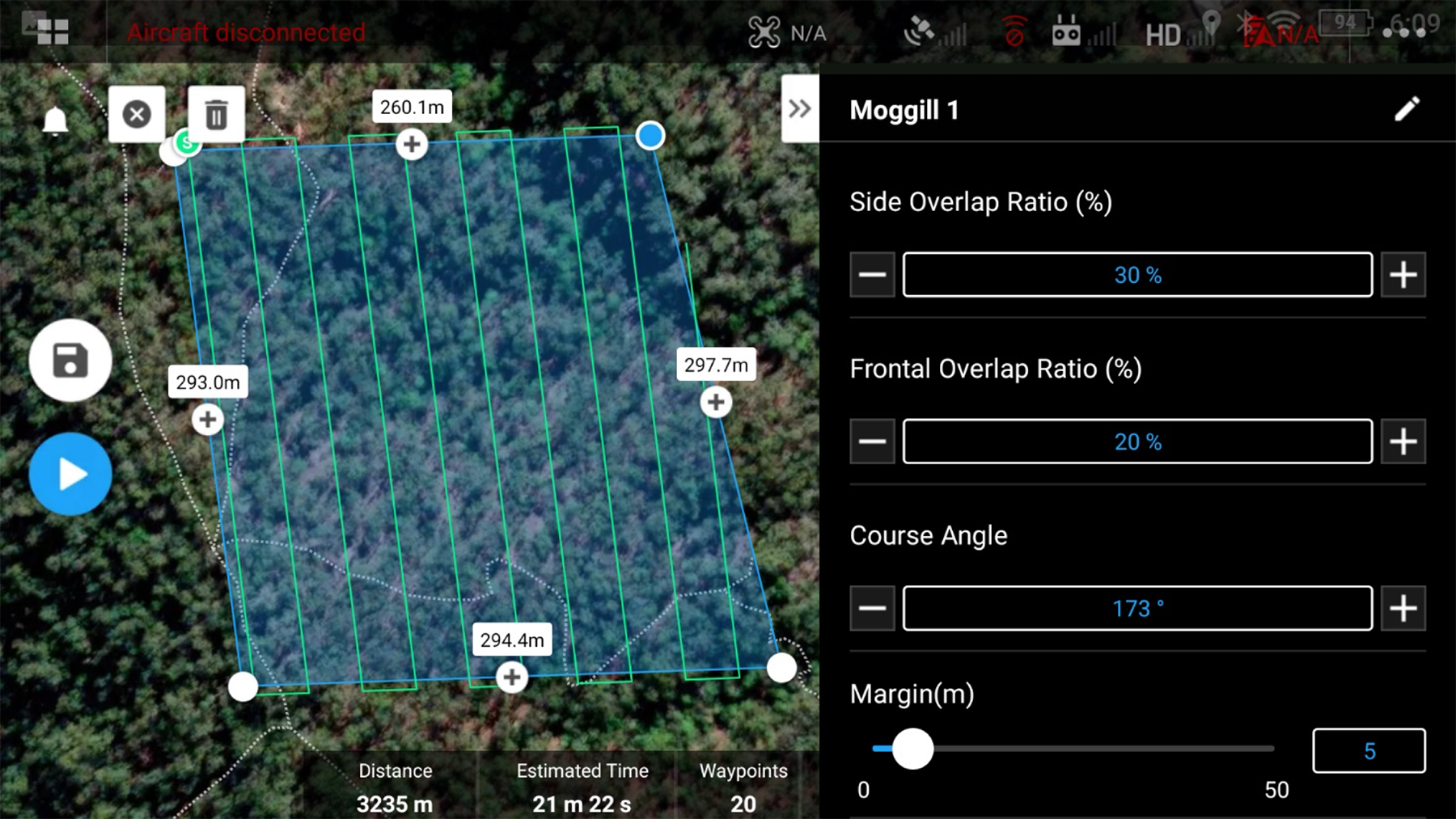 As you can see from the figures above, the chosen parameters for your automated flight can drastically change the flight time. Multi-battery missions are possible but require the ability to pause the mission, fly the drone home, switch batteries, fly back to the point that the mission was paused and restart the mission from there. If the mission is covering a large area, it may be necessary to change take off locations partway through to ensure you can maintain VLOS during the entire mission. In this case it is recommended that you simply plan two separate missions and then combine the data afterwards.